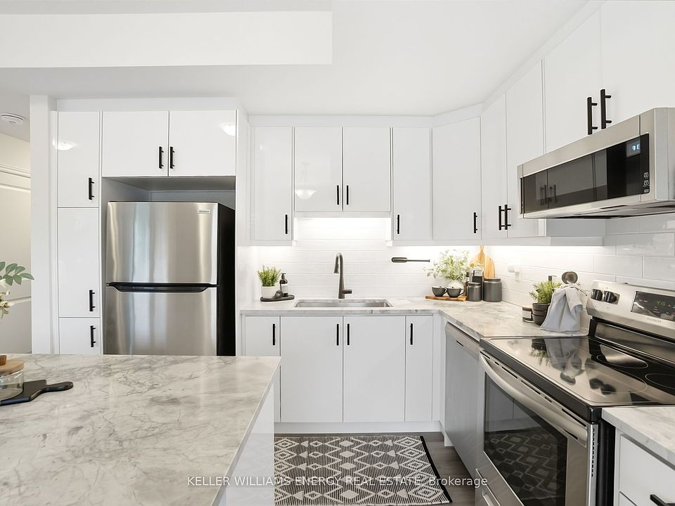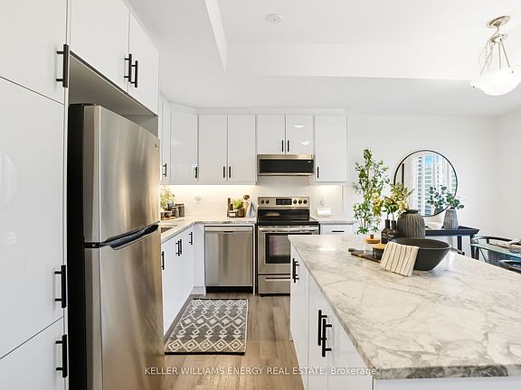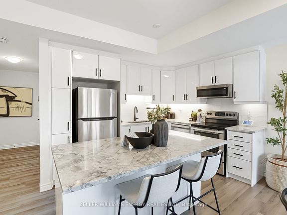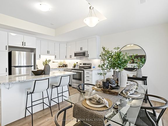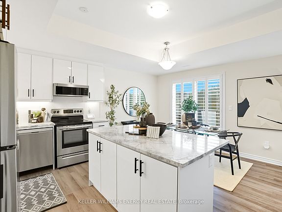 Welcome to this stylish, move-in ready, 2-bedroom, 3-bathroom townhome tucked on the edge of the community, offering privacy and no direct view of other townhomes. The layout is both practical and inviting, with a chefs kitchen offering extended cabinetry and plenty of storage, a bright living room with a fireplace, and a dining area that opens to a balcony. A powder room completes the main floor. Upstairs, you'll find two generous bedrooms, one with its own balcony and the other with a 4-piece ensuite, plus an additional full bathroom and convenient second-floor laundry.This home is filled with natural light and upgraded throughout, including smooth ceilings on the main floor, 12x24 porcelain tiles and comfort-height vanities in the bathrooms, stainless steel appliances, California shutters, matte black hardware and fixtures, double panel doors, stone countertops, valance lighting, and a modern backsplash.The location offers easy access to Highways 401, 407, 412 & 7, as well as public transit. Families will appreciate being in a strong school district, steps from a new elementary school and close to nearby trails and parks. Everyday shopping and dining, including The Shops at Pickering City Centre, local plazas and unique grocery stores, are just minutes away, making buying this home an unbeatable opportunity. All thats left is your personal touch, just bring your furniture and start enjoying your new home!