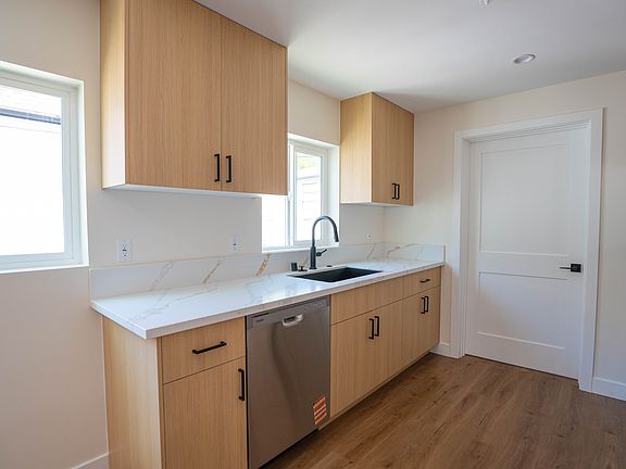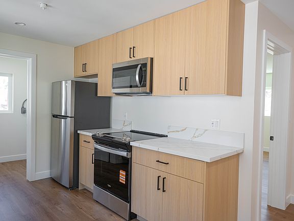 This 819 sq foot ADU is located on the second floor and was thoughtfully designed to offer a bright, open flow layout for modern everyday living. Inside, you'll find Mid-Century inspired finishes with warm, wide plank floors that add a welcoming touch. The kitchen stands out with brand new stainless steel appliances including an electric stove, refrigerator, dishwasher, and microwave, that are additionally paired with sleek quartz countertops and European style cabinetry that have black finishes. Whether you love cooking at home or simply want a fresh, modern space that's easy to enjoy, this kitchen delivers.