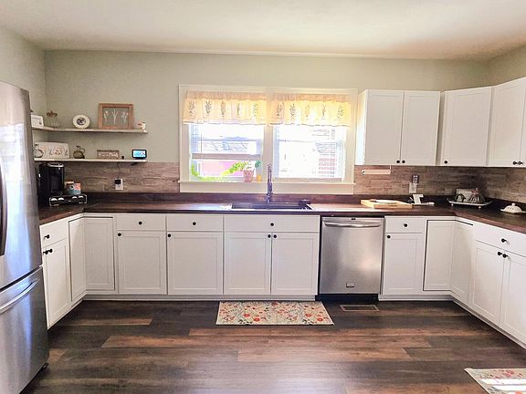 And there's more!....Remodeled in 2024, the kitchen features white cabinetry, butcher block countertops, tile backsplash, large sink and vinyl plank flooring. Stainless steel refrigerator, dishwasher and gas range with microwave/hood vent complete the look.