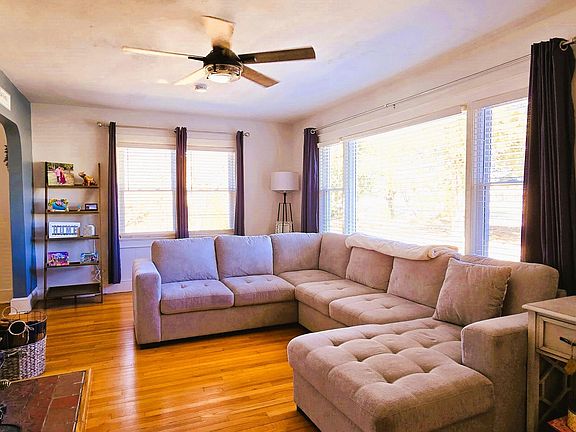 Through a beautiful archway, hardwood floors continue into the inviting dining room. A new pendant light fixture and bright windows are an added bonus!