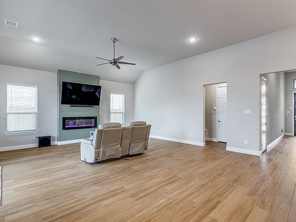 Welcome to this premier 55+ active adult lifestyle community! HOA includes front yard maintenance!!! This open concept Trophy Signature home has plenty of natural light to highlight every detail in mind for discerning buyers, including 12-foot vaulted ceilings throughout. With three bedrooms and a study there is plenty of room to set up the home for your personal lifestyle. The primary bedroom is at the back of the home for maximum privacy. The study is also at the rear of the home so no distractions while working. The beautiful kitchen features a huge Quartz island with built in wine rack, and wine or beverage refrigerator; double ovens; large walk-in pantry, stainless appliances with gas cooktop and beautiful dining area overlooking the patio. the living room has a remote controlled electric fireplace for great ambiance on a romantic evening. Lovely hardwoods throughout common areas. Beautiful carpet in bedrooms and stunning ceramic tile in the baths. Low maintenance backyard with extended patio are and artificial turf in the rest of the yard. This home is energy efficient with foam insulation, tankless water heater, home automation package with video doorbell and energy efficient windows and appliances. Visit the community center with fitness center, pool, pickleball, fire pits and community events so you can feel right at home. The location is amazing – so close to shopping and conveniences provided by easy access to both US 75 and SH 121.
