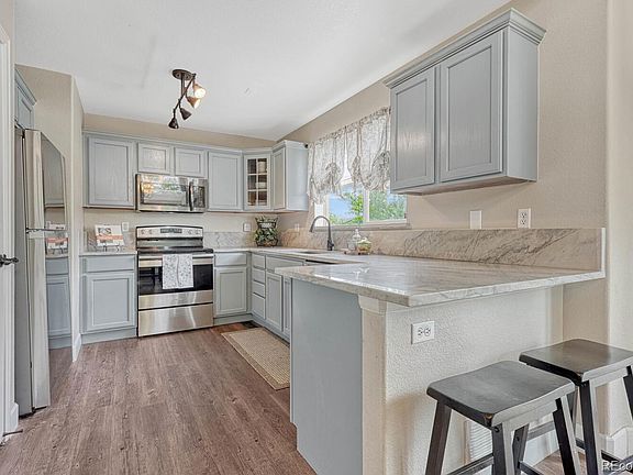 Highlands Ranch Southridge home, perfectly nestled in a cul de sac is now on the market! Welcome to this 4 bed, 4 bath home with a finished basement and 2 fireplaces. The lot is special due to an oversized front yard with space between the homes. Mature trees, privacy, cozy front porch, new stamped concrete patio and well maintained yard make this a great place to call home. The new owner renovated the home with new carpet, laminate vinyl plank floors, new quartz countertops, painted cabinets, new crushed granite sink faucet, hardware , lighting and interior paint. The seller is including the washer, dryer, all rods, window treatments and kitchen refrigerator. Don't miss the whole house attic fan, vaulted ceilings with plenty of natural light. The open concept floor plan allows for kitchen dining with access to the family room. Enjoy the primary suite with the 5 piece ensuite master bath along with 2 more upstairs bedrooms and full bath. Additional bedroom/office is located in the finished basement, enjoy the cozy fireplace and 1/2 bath. The extra square footage allows for endless options in the basement, media room, office, bedroom, etc. This location is close to Highlands Ranch Town center, schools, parks and recreation centers. With no home directly behind 10340 Kelliwood Way, you will enjoy sunsets in a serene setting. The seller has upgraded and maintained this home to make it a great find, set a showing soon!