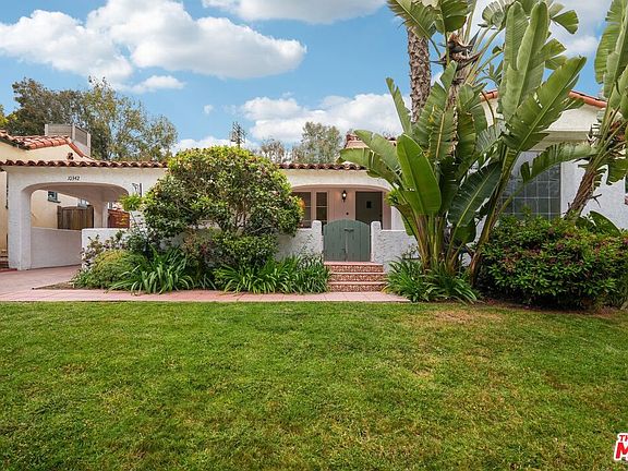 Lovely Spanish Revival style Westwood home full of original charm and many surprises. Set up above the road in the Century Glen neighborhood, this 4 bedroom home is filled with natural light and warmth, and includes a large finished basement. Enter through a spacious front courtyard, where you'll want to linger and watch the sky change colors, then step inside a quintessential Spanish with all the details that make this architectural style irresistible. The living room features soaring vaulted ceilings with exposed beams, a stained glass picture window and a decorative fireplace. The dining room has space for a very satisfying dinner party, and connects visually with the kitchen, living room and front courtyard. Repeating archway details create a unifying motif throughout this space, while new wood-look flooring and multiple skylights make it feel bright and uplifting. The galley kitchen features a large Sub-Zero fridge, wine fridge, Miele dishwasher, and recessed lighting. The large primary bedroom has 3 deep cedar lined closets, as well as an ensuite bathroom with a skylight above a deep soaking tub, and a separate shower. A second bedroom and full bathroom are conveniently located beside the primary suite. At the opposite side of the house, you'll find a third bathroom and two additional bedrooms, the larger of which opens to the rear covered patio and the yard beyond. You'll also enjoy a full laundry room where you can centralize cleaning supplies. But one of the best and most surprising elements is the large finished basement below, offering approximately 300 additional square feet of usable space for a gym, office or home theater. Detached rear garage features skylights and could potentially be finished or converted to an ADU for more living space. Secure automatic gate encloses driveway for safety and large Rubber Fig and Eucalyptus trees make the backyard a private oasis. Close to Rancho Park, Century City and in the Westwood Charter Elementary attendance zone, this home has so much to love.