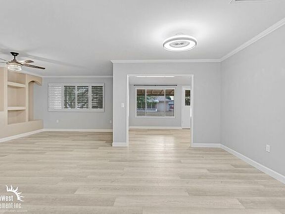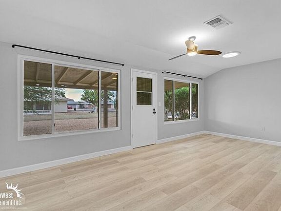 Beautiful 3Bdm 2Ba Home in Suncity! Spacious family home featuring light wood flooring, neutral tones, and abundant natural light throughout. The open-concept layout flows seamlessly from the bright living area to a modern kitchen with white cabinetry, sleek countertops, stainless steel appliances, and a built-in wine rack. Well-appointed bedrooms offer plush carpeting, ample storage, and ceiling fans for year-round comfort. The stylish bathroom showcases marble-style tile, a quartz vanity, and premium finishes. Enjoy outdoor living in the serene backyard with a covered patio and mature Palo Verde trees. Includes a two-car garage.Tenant pays all utilities. This property allows self guided viewing without an appointment. Contact for details.
