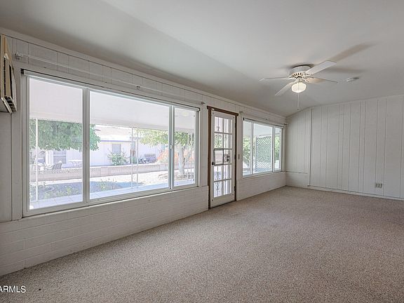 This charming 2 bed, 1.75 bath, 2 car carport is a good value, in good shape. Some replaced features such as: Sewer line, roof, HVAC, vinyl dual pane windows,upgraded breaker box & aluminum soffits. Kitchen has solar tube skylight, tile backsplash on wall with sink & nice breakfast nook with ceiling fan. Double door entry for easy moving. Skylight in LR. 3 Ceiling fans.Toilets replaced to raised height. Step-in shower in master with built in seat. There is a lovely large covered & tiled patio (34x11) A 13x3 attached storage shed next to back patio for your yard tools, etc. Knee high block wall surrounds property. Laundry room is off carport that has laundry sink and cabinets for additional storage. Evap cooler ''as is''. Not sure if works. Leased solar $120.00 mo pmt.