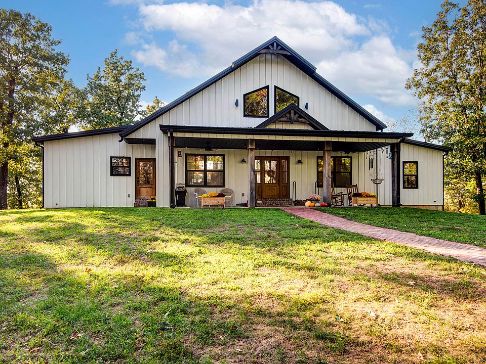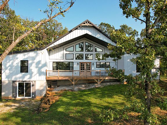 Stunning Custom One-Owner Home on 10 Acres. As you approach this one-of-a-kind masterpiece, you'll be amazed by its unique architecture and craftsmanship. This custom-built home beautifully blends Shouse-inspired design with cabin-in-the-woods charm, showcasing exceptional quality and attention to detail throughout.Offering approximately 2,781 square feet of finished living space plus 630 square feet of unfinished basement, this home provides both comfort and functionality.Step through the front door and be greeted by soaring ceilings, gorgeous hardwood floors, and a dramatic wall of windows that frame breathtaking views of the surrounding landscape.The spacious floor plan includes 4 potential bedrooms (one non-conforming), 2 full bathrooms, a large living room with a cozy wood-burning fireplace, a formal dining area, and a fabulous eat-in kitchen. The kitchen is a true showpiece, featuring custom cabinetry, quartz countertops, a massive island with bar seating, and a premium appliance package including a gas range--perfect for any gourmet chef.The primary suite is oversized and offers beautiful views of the property. Its spa-like ensuite includes dual vanities, a luxurious soaking tub, and a walk-in shower.A standout feature of this home is the loft area, accessed by a striking spiral staircase--a fun and functional space for kids or adults alike.Exterior features include a metal roof and 26-gauge steel siding for virtually maintenance-free living. Enjoy the serenity of 10 park-like acres, offering privacy, panoramic views, and plenty of space to explore. Relax or entertain on the covered porch or expansive deck, perfect for enjoying quiet Ozarks evenings.The property also includes a 30x40 shop building with concrete floors, two 8x10 garage doors, one 9x7 garage door, and dual 10x40 lean-tos--ideal for projects, hobbies, or extra storage.This exceptional home is truly one of a kind. Call today for your own private viewing!