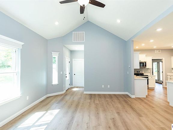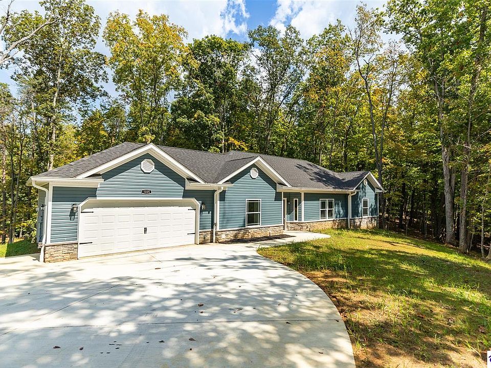 Come tour this stunning 3 bedroom, 2 full bath ranch home in Vine Grove. The floor plan is open with plenty of space to comfortably arrange your furniture. The living room has a vaulted ceiling and is open to the dining area, which features custom trim work and walks out to the large deck. The kitchen overlooks both areas and features quartz countertops, an island, stainless appliances, and a pantry. The laundry area is conveniently located in the mud room area off of the garage interior entrance. The primary suite has a tray ceiling and a ceiling fan with a walk in closet in the bedroom as well as another walk in closet off the primary bathroom. The bath has dual vanities and a nice floor to ceiling tiled shower. The primary suite has private access to the back deck. The other 2 bedrooms are on the opposite side of the home, are both large, and have ceiling fans. This is a true gem, don't let it slip away! Call today for your showing!
