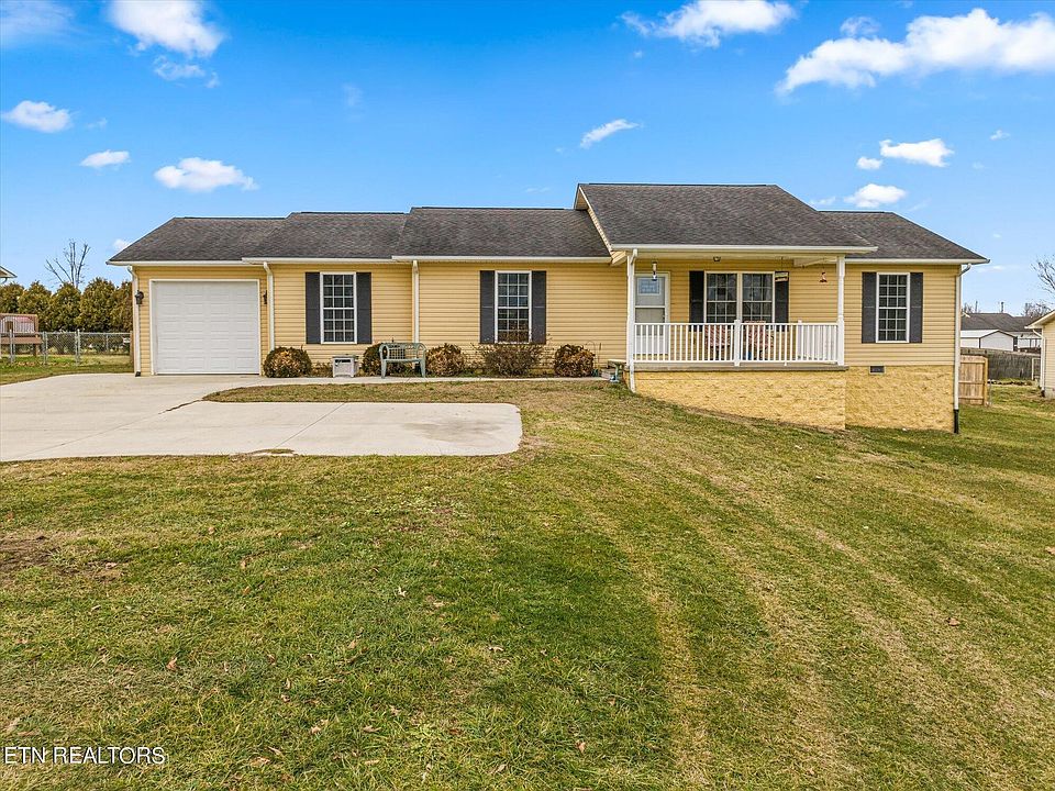 Welcome to 1035 Cook Rd in Crossville, TN! This inviting ranch-style home with great curb appeal features a single-car garage and offers a spacious living space with 4 bedrooms and 2 bathrooms, totaling 1600 square feet. Situated on an expansive lot of almost half an acre, this home is perfect for those who appreciate outdoor space. As you approach the house, you'll be greeted by a covered front porch, ideal for relaxing in a rocking chair or sipping your morning coffee. Step inside, and you'll find a laminate wood-floored living room that seamlessly connects to the kitchen in a great room concept. The kitchen boasts ample counter prep space, a gas range, and stainless steel appliances. Natural light pours in through the window above the sink and the glass slider doors in the eat-in kitchen/dining area. The primary suite offers a private bathroom for added convenience, while the remaining 3 bedrooms are serviced by a full guest bath. Laundry alcove and mudroom off of the garage offer great organization and storage spaces. One of the additional highlights of this home is the large covered patio off the dining area, providing the perfect space for entertaining and outdoor dining. From the patio, you'll have a view of the expansive, level, and fully fenced backyard, offering plenty of room for outdoor activities and gardening. If you're looking for a comfortable and welcoming home with great indoor and outdoor spaces, 1035 Cook Rd is the perfect choice. Don't miss the opportunity to make it your own!
