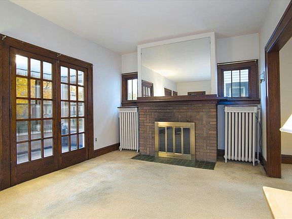 Brick hearthGenerous roomsLeaded glass french doorsWide trimHardwood floorsLarge closets