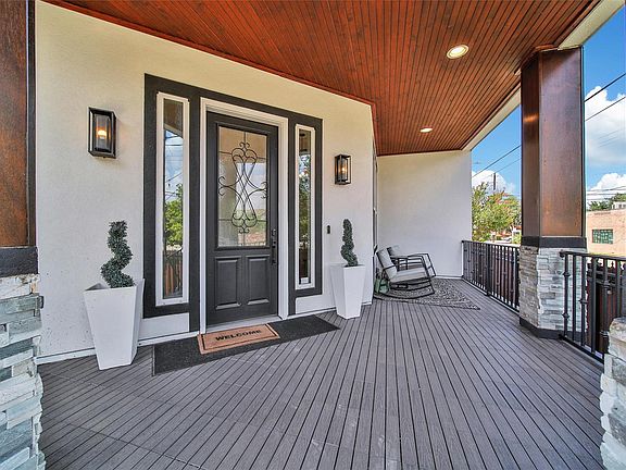 Experience modern Heights living on a premium corner lot! This upgraded 4-bedroom, 3.5-bath home offers an open first-floor layout with a formal dining room, inviting living area, and chef’s kitchen. Fully furnished with décor included, it’s move-in ready—or ideal for Airbnb. Upstairs, find two spacious secondary bedrooms, an office nook, and a luxurious primary suite with dual closets and a marble bath featuring a jetted tub and separate shower. The third floor boasts a theater room, wet bar, and fourth bedroom with ensuite bath and balcony views of the downtown skyline. Gated front and rear access, full perimeter fencing, and a detached two-car garage—perfect for a future studio—provide security and versatility. With a new roof (2021), this property blends style, comfort, and investment potential. This home is nestled in the heart of the historic Houston Heights with close proximity to Memorial Park, Downtown, the Galleria and M-K-T shopping and restaurants.