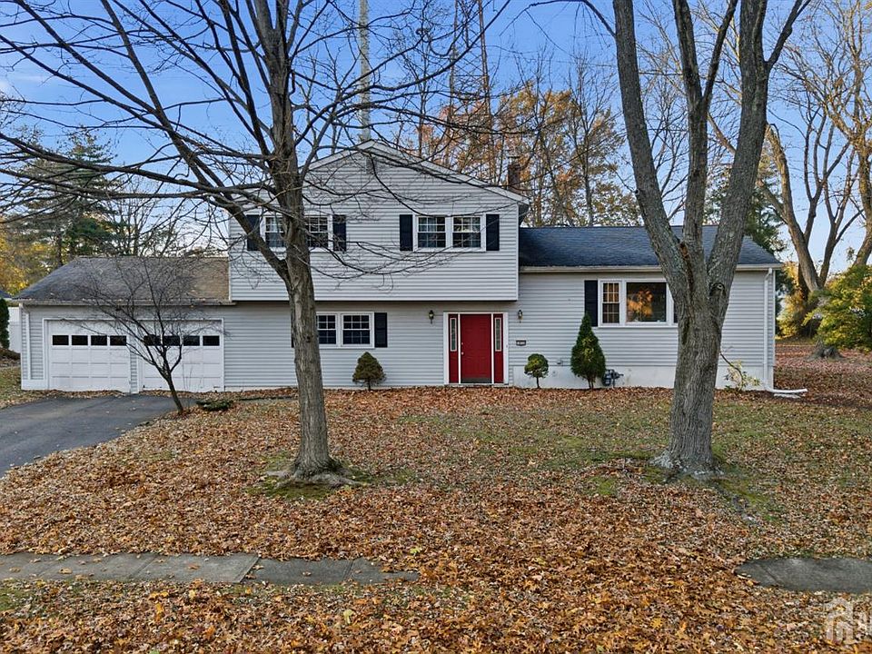 Stunning 4-bedroom, 2.5-bath split-level home in one of the area's most desirable neighborhoods, offering a refined blend of space, style, and modern comfort. The open foyer leads to a spacious family room with recessed lighting, crown molding, and direct access to the finished two-car garage with attic storage. This level also features an updated powder room, a tiled laundry room with backyard access, and a versatile bedroom/office with a wood-burning fireplace and stone surround. The second level showcases an elegant living and dining area with hardwood floors, recessed lighting, and sliders to a huge maintenance-free deck overlooking the expansive yard. The upgraded kitchen offers granite countertops, light oak cabinetry, tile backsplash, pantry storage, and built-in desk area. Upstairs are three generous bedrooms, including a large primary suite with organized closet and updated full bath. The main bath features double sinks, decorative tile, and a tub/shower with glass doors. A finished basement adds valuable living space with tile floors, recessed lighting, and a large utility/storage area. Outdoor living shines with a massive maintenance free deck, lower patio, and wide open backyard. Close to NYC bus/train, shopping, restaurants, all major roadways & more. A rare opportunity to own a beautifully updated home in a premier location.