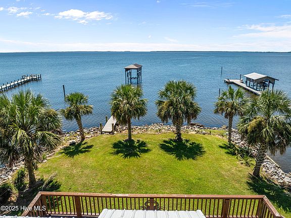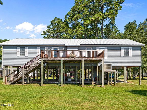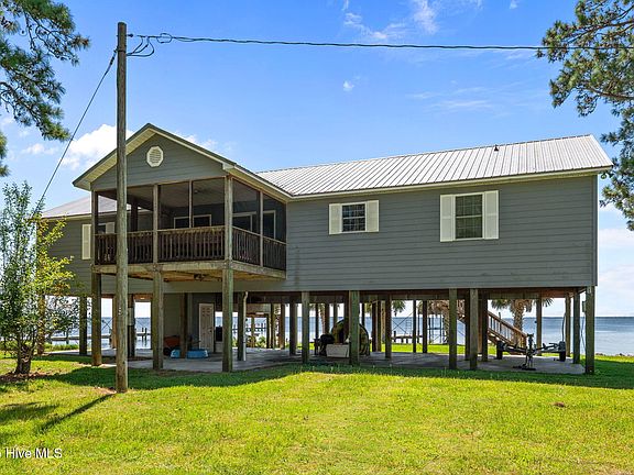 Cute house situated on a point of the Pamlico River. New 100 ft Hog Slat pier. Hardy Plank siding on the house with a metal roof for easy low kept maintenance living. Industrial elevator for easy access. Four bedrooms and two baths. Screened in porch. Open floor plan with a pool table and fireplace. Underneath the house is open on raised pilings for cooking out, playing corn hole, cooking blue crabs caught right off your very own pier, Separate covered shelter for boat storage. Move in ready just bring your personal items.