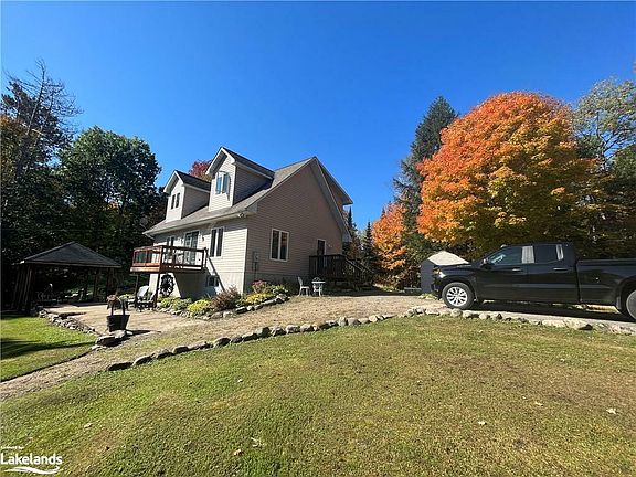 Located on a Private Road with deeded Right of Way, this 4 bedroom, 2 bathroom 1800 SQ FT cape cod style home, is nestled on a 1.1 acre lot at the end of a dead-end road for privacy. The main floor of the home features a large bright eat-in kitchen with a walk out to a deck, a living room, a 3pc bathroom, and a bedroom. The upper level features the Primary bedroom, 2 additional bedrooms a 3pc bathroom, and a laundry room. The partially finished basement has a walk-out door, and is currently used as storage area, but could be updated for additional living space. The property also features a detached Single Car Garage, a garden shed , and a workshop which is currently used as a man cave, plus a large gazebo with concrete floor. The property shows pride of ownership with perennial gardens and a fire pit area for entertaining. The location is ideal with a public beach area on Hall's lake just a short walk away, and a boat launch just 5 minutes away. You are also less than 30 minutes away from Dorset, Algonquin Park, Minden and Haliburton and Huntsville and Bracebridge are only 45 minutes away for all your shopping needs. Don't miss out on this great country home.