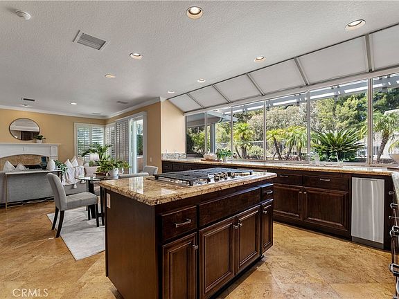 At the heart of the home, the expansive kitchen is designed for both daily living and entertaining. Granite countertops, stainless steel appliances, built-in refrigerator, 5-burner cooktop, and walk-in pantry provide everything a chef could want. The oversized bay window floods the space with natural light while overlooking the sparkling pool. Just beyond, the inviting family room with fireplace offers the perfect place to gather, with sliding glass doors leading to the backyard oasis.