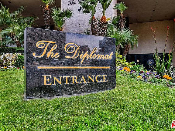 Experience spectacular sunrises and sunsets with panoramic views spanning from Holmby Hills, LA Country Club, Griffith Park Observatory, to downtown LA in this light filled condo. Open floor plan that features 2 bedrooms plus a den/office with built-in bookshelves and a wall of enclosed built-in storage space. Wake up to views in the spacious master bedroom with 3 large closets (2 of them walk-ins) and a beautiful master bath with double sinks, granite countertops, tile floors, and recently redone shower with granite tiles. 2nd bedroom with it's own bath. Kitchen has an eating area, hardwood floors, granite counters, white cabinets and double ovens. Laundry room in unit. The Diplomat is a full service 24 hour security bldg with concierge, valet parking, gym, pool, sauna, and rec room. Secured 2 side by side parking spaces and loads of extra storage in garage area.