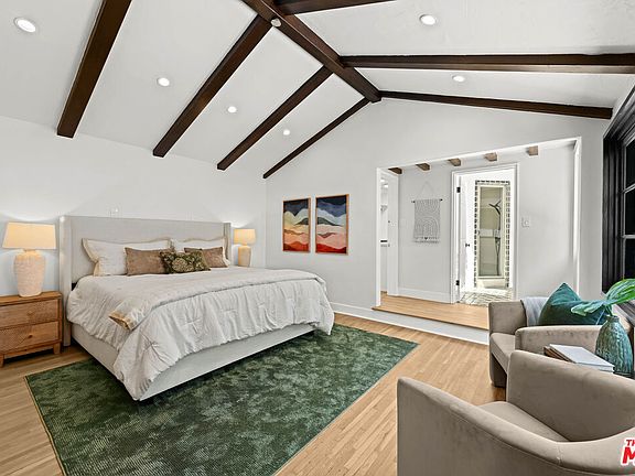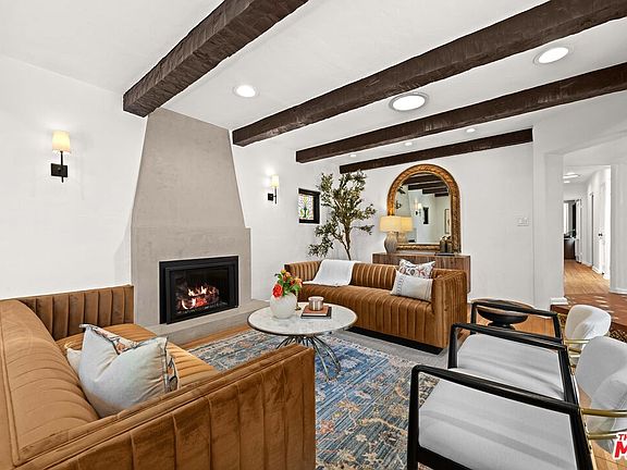 Located on Dunleer in the heart of Cheviot Hills, this 3-bed, 3-bath home showcases timeless Spanish-Mediterranean design, featuring custom tilework, stained glass details, exposed wood beams, and elegant arched architectural accents. Inside, natural light floods through soaring ceilings and skylights, highlighting the open layout and warm character throughout. The inviting living room centers around a beautiful fireplace and is framed by multiple French doors that open to the courtyard, where a second outdoor fireplace adds to the home's cozy, welcoming atmosphere. The kitchen boasts quality appliances and flows seamlessly into the main living areas. Custom terracotta tilework can be found throughout other parts of the home, enhancing its authentic charm. The primary suite offers generous space and a large walk-in closet. The second bedroom is bright and well-sized, with a calm, comfortable feel, while the third bedroom includes an upstairs loft perfect for a home office or creative space. Two bathrooms both feature soaking tubs and walk-in showers, complemented by a third stylish powder room with custom finishes. Gated for privacy, the property includes ample parking, a private garage, and a saltwater pool, jacuzzi, and heated outdoor shower creating a serene outdoor oasis ideal for relaxation or entertaining.