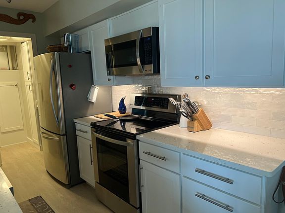 The view as you enter this beautifully remodeled 4th floor condo is breathtaking. White shaker kitchen cabinets with under cabinet lighting, quartz countertops, high end stainless steel appliances and beautiful backsplash. Luxury vinyl plank runs entirely through the living areas, both bathrooms have tile floors, master has a walk in shower and beautiful cabinetry. Bedrooms are carpeted and primary with king bed.All windows in bedrooms have been replaced with hurricane impact windows. Hurricane shutters for the slider to balcony. Electrical updated. Hot Water Heater replaced. All work done 2022. This unit comes with a covered parking space. The waterfront pool area includes heated pool with saltwater purification system, spa, outdoor dining and gas grills. It has a raised sun deck with plenty room for lounging in the sun. Fishing Pier and the boat slips are rented to owners when available. Paradise Island Towers is within walking distance to the beautiful Treasure Island Beach, restaurants, and shopping.