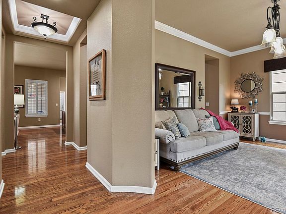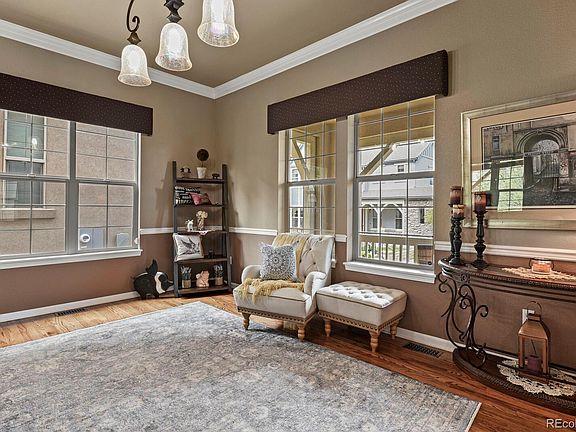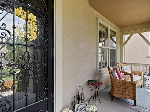 Sit on the covered front porch of this beautiful home and enjoy your morning coffee looking over the peaceful courtyard. Walking in the front door, you will immediately notice the beautiful detail in the ceiling with crown molding. There is a formal dining room (currently used as a sitting room) and a formal living room (currently used as a fitness room). A powder room is centrally located on the main floor. Enter a beautiful kitchen with an expansive island and abundant cabinetry with a brand new wine fridge! There is a large pantry, coffee bar and an additional dining area. The separate stairway leads to a private office with custom built in shelves and cabinets. The large desk is included. The office has its own bathroom and Cassette heat/ac unit. The upstairs level includes a large primary bedroom, with its own LG wireless cassette indoor heat/ac, with dual custom closets. Additionally the primary bath has a large soaking tub and huge walk in shower with dual shower heads. There are two large additional bedrooms with a shared bath that includes dual sinks and a tub/shower combo. The finished basement is an entertainer's dream with a large great room and wet bar and beverage fridge. The 4th bedroom is in the basement. Additionally there is a 3/4 bath with a walk in shower. Tons of storage that includes the storage shelves, as well as a wine rack. The three car garage includes tall cabinetry for storage. There is a brand new (in 2025) gorgeous, private outdoor patio with a gas grill for outdoor entertaining. Additionally, A brand new privacy fence was completed in October. Enjoy the beautiful Bluffs Regional Park just steps from your front door! Close to I25, the light rail, Park Meadows Mall, and an array of dining options!