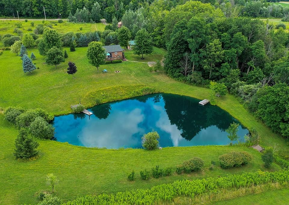 Welcome to your tranquil retreat! This delightful 2-bedroom, 1-bathroom cabin sits on 5 acres of rolling hills, surrounded by lush greenery and natural beauty. The interior boasts beautiful woodwork, from exposed beams to custom cabinetry. Rustic charm meets modern comfort. The open-concept living and dining area is perfect for gatherings. Large windows invite natural light and offer serene views of the landscape. Prepare meals in the well-appointed kitchen with ample counter space and storage. Imagine relaxing by your own private pond, where you can fish or simply enjoy the peaceful ambiance. Explore the 5 acres—ideal for hiking, gardening, or picnics. The rolling hills provide a sense of seclusion. Near Keuka Lake & Hammondsport.