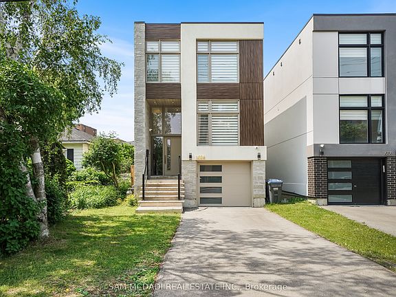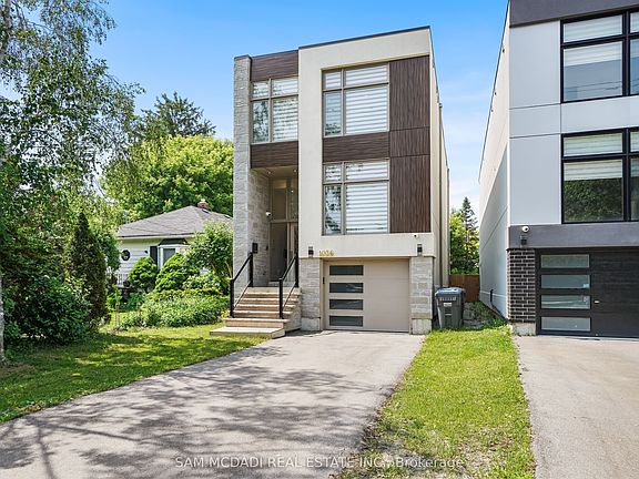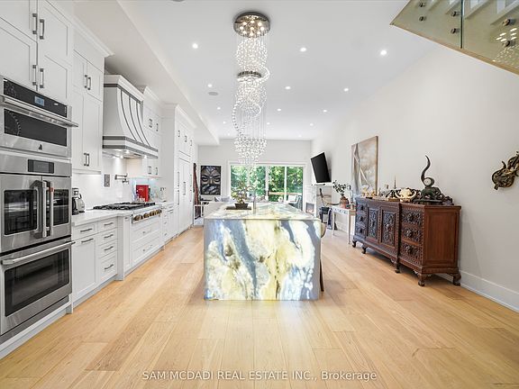 Set in one of Mississauga's most sought-after and evolving neighbourhoods, 1036 Enola Avenue isn't just a home, it's a daily escape into luxury and modern living. Just minutes from the upcoming Lakeview Village, Port Credit, and Lake Ontario's shoreline, this stunning residence blends sophistication with everyday functionality, offering over 3,600 sq ft of meticulously finished space. With no detail overlooked, this custom showpiece features 11-ft ceilings on the main level, open-tread staircases, and sleek glass railings that create effortless flow and sophistication. At the heart of the home, the chef's kitchen is outfitted with built-in premium appliances, custom hood, and a showstopping illuminated imported marble island. Pot lights, wide-plank flooring, and integrated speakers enhance the modern aesthetic. The adjoining living area is anchored by a sleek gas fireplace and full-length windows framing tranquil, green views. The spa-inspired primary suite offers a sculptural soaking tub, dual rainfall shower towers, and a custom walk-in closet. Additional bedrooms are generously sized with designer finishes, and a skylight above the upper hallway floods the space with natural light. The fully finished lower level elevates the living experience with a glass-enclosed wine cellar, private sauna, and a separate walk-up entrance, ideal for extended family, a home office, or rental income. A modern bathroom with double vessel sinks completes the space. Each level features built-in iPad screens connected to the door camera system for secure, voice-enabled entry, while integrated speakers throughout the home are powered by a premium Onkyo audio system perfect for immersive, whole-home sound. Outside, a fenced yard and deck create a private setting for summer entertaining. Just steps from lakefront parks, golf, top-tier schools, and with easy access to the QEW, Highway 403, and the GO Station, this is luxury living in Lakeview at its finest.