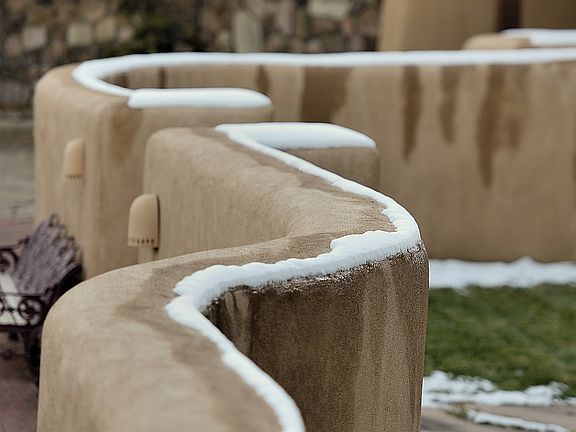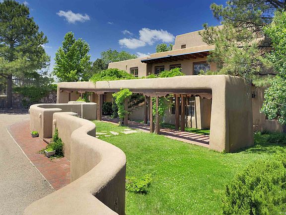 Unique opportunity to own a very special property designed by Santa Fe Opera architect John McHugh and built by iconic road building contractor Jimmy Johnson, just minutes from the Santa Fe Plaza. Located off Bishop's Lodge Road, with gorgeous mountain views, this grand and spacious 3 bedroom 3.5 bath home showcases wonderful historic features: antique door handles, hand-carved mantels, wrought iron doors, rich wood details, and beams and bricks from the old military chapel La Castrense. Enter through a gracefully curved walled courtyard and into a generous living room with a 24' beamed and latticed ceiling, intricately tiled floors and a balcony library with built-in bookcases and sunroom. A separate den includes light pine floors, an undulating coved ceiling, and an impressive stone fireplace. With views to the outside gardens, the eat-in kitchen is filled with light in early morning and again at dusk. Master and guest bedrooms are on the main level and a separate downstairs suite with kitchen, living room, bedroom and bath is perfectly private for guests. A bonus studio, media room, or additional living space of approximately 3,000 heated square feet adds extra living area. Wrap around ivy-draped portals provide exceptional 360-degree views and delightful alfresco entertaining. This wonderful country estate, graced with ancient petroglyphs and with mature gardens and orchards irrigated by a private well, offers a timeless, secluded oasis to enjoy.