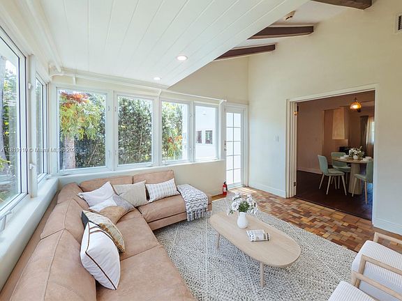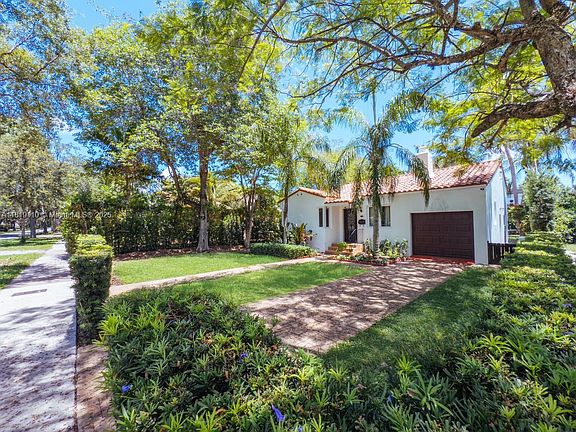 Rare and exquisite residence situated in the heart of Coral Gables, near the iconic DeSoto Fountain and Biltmore Hotel and Golf Course. As you enter, you are greeted by high cathedral ceilings, beautiful hardwood floors, and a wood-burning fireplace. Natural light streams into the Florida room, which overlooks the manicured backyard, complete with privacy hedges. Enjoy the warmth of this well-maintained home, which features two bedrooms with en-suite bathrooms and a walk-in closet adjacent to the primary bedroom. The spacious kitchen showcases custom cabinetry and opens into the dining room, providing ease of entertaining. The immaculate one-car garage is located just off the kitchen with washer, dryer and tankless water heater.