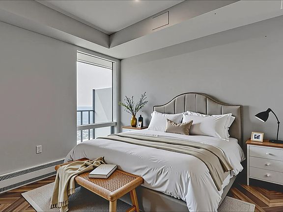 Beautiful river valley viewsWaterfall countertopFloor-to-ceiling windowsNatural walnut floorsTile surfaces in bathsConvenient in-suite laundryIndividual temperate control