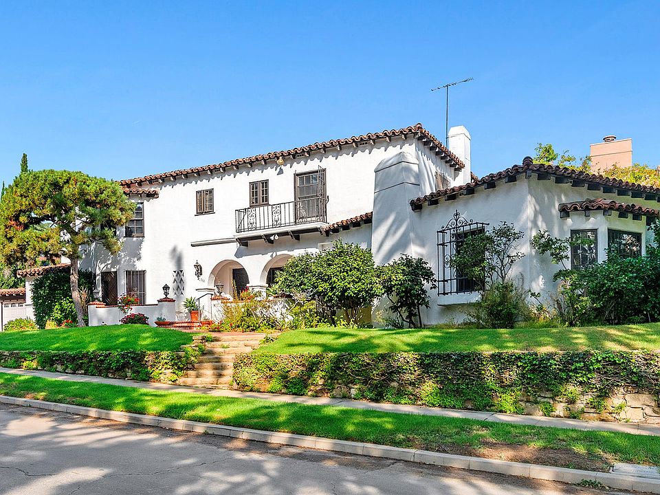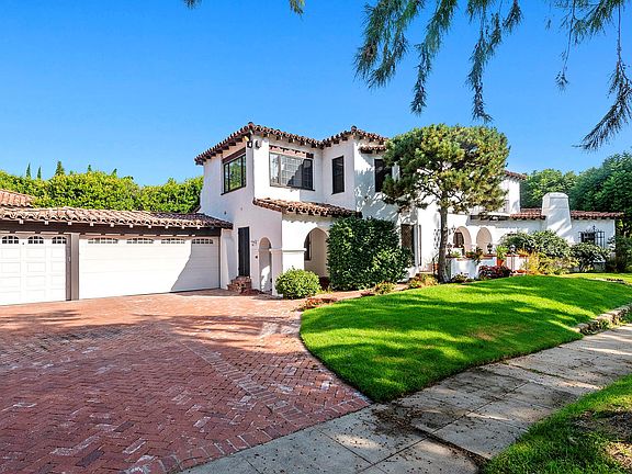 A one-of-a-kind Romantic 4 bed/ 5 bath + office and den Spanish mini-estate located on a prime, stunning Little Holmby large corner lot with incredible curb appeal. Thoughtful 1929 architectural details throughout blended with updated features throughout the home and beautifully maintained. Inviting brick front patio opens to dramatic formal entry with closet and powder room, detailed stained glass windows and terracotta tiled entry floor. Spacious step-down grand living room with decorative fireplace, wood beamed high ceilings and French doors to private back patio. Cozy den of living room with decorative fireplace and a hidden speakeasy bar opening to back patio, ideal for entertaining. Large formal dining room overlooking front yard opens to butler's pantry and chef's kitchen with newer Sub Zero oversized refrigerator, gas range and double ovens and separate breakfast room with built-ins. Laundry room of kitchen and office/den with skylight and access to driveway and garage. Upstairs includes 4 bedrooms including original painting ceilings in hallway and primary suite with beautiful treetop views, separate sitting room, vanity and walk-in closet. Primary bathroom with separate bath and shower. 2nd bedroom with built-ins and used previously as office and shares a tiled bathroom with 3rd bedroom. 4th bedroom with ensuite 3/4 bath. Additional features include hardwood flooring, archways, period details including authentic wrought iron railings and doors, fixtures and custom carved and stenciled doors throughout, upstairs covered balcony with room for seating and outdoor enjoyment, built-in shelves in upstairs hallway, central ac/heat and spacious 3-car garage with auto doors and an additional gated side yard area next to garage.