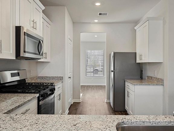 This home was built with entertainment in mind. It's an open and spacious one-story home which features a private dining room, a modern upgraded kitchen, a large family room, a fenced-in backyard and an extended covered patio, additionally the kitchen features some stunning white cabinets with brushed nickel knobs, a full suite of whirlpool appliances including a refrigerator and built-in microwave, recess LED lighting, polished granite countertops and luxury vinyl plank flooring. In the master suite, you will find a spacious En-suite which boasts a separate large soaking tub and step-in shower. There are two additional bedrooms which share a tub and shower combo. Our recreational park is sure to have something for everyone, it features a zip-line, splash pad, picnic area, walking/jogging path and a variety of slides.