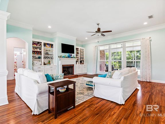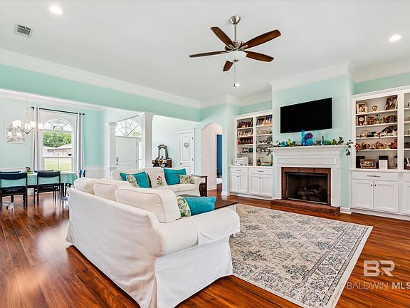Welcome to Oaks of Fowl River located in sought after Theodore/Bellingrath Garden area. This traditional 4-bedroom 2 bathroom four-sided brick home has all the charm you would expect in southern living. Your front yard landscaping is low maintenance with beautiful curb appeal. Walk up to your inviting covered front porch to find the perfect spot to enjoy your morning coffee. As you enter your front door, the first thing you notice are the high ceilings, arched entryways, crown molding and custom lighting. The open floor plan allows you to see into the formal dining room which features crown molding, double arch entries tall windows that bring in plenty of natural sunlight. There are stunning engineered laminate wood floors throughout the main living space that make for easy maintenance. The living room features a gas log fireplace, a mantle, high ceilings, double crown molding, double pane storm windows, and it opens directly into the beautiful modern kitchen. The kitchen features a granite breakfast bar, with stainless steel sink, and stainless steel appliances. This kitchen has plenty of storage above and below. There is also an informal eat-in area that brings in an overflow of sunlight. The kitchen also has a large pantry, perfect for all your storage needs. There will be no shortage of fun activities in your oversized backyard. The backyard is leveled and the grass is plush and green. The split floor plan features a primary suite bathroom with separate shower and garden tub, granite double vanity sinks with plenty of storage, ceramic tile floors, custom mirrors and a separate water room with a privacy door. All of the windows are double pane storm windows and have hurricane shutters that will remain. Property has a generator, Gold Fortified Roof, 2-10 Builder warranty, water filtration system and termite contract with Wayne's Pest Control. Builder information as well as the original survey and plans will remain with property. Buyer to verify all information dur