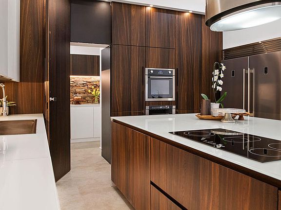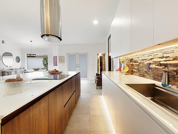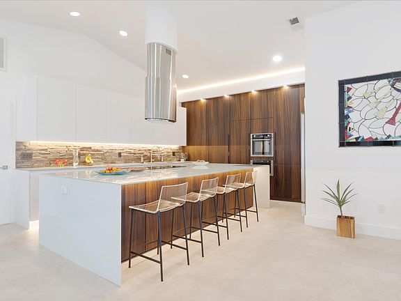 48" x 24"matte finished imported porcelain tile, huge chef contemporary Italian kitchen with unique secret butler's pantry, massive 12x6 island dressed in rich 1/2" glass countertop including waterfall, undercabinet lighting throughout, stainless steel highend kitchen appliances, oversized 60" built in fridge/freezer, unique design ceiling mounted Falmec 30" Ellipso Island range hood (ducted & vented outside) glass enclosed refrigerated wine cellar, custom walk-in closets in all bedrooms, covered outdoor kitchen w/quartz bar counter top, Intergrated sink, faucet, mini fridge & stainless steel cabinets.