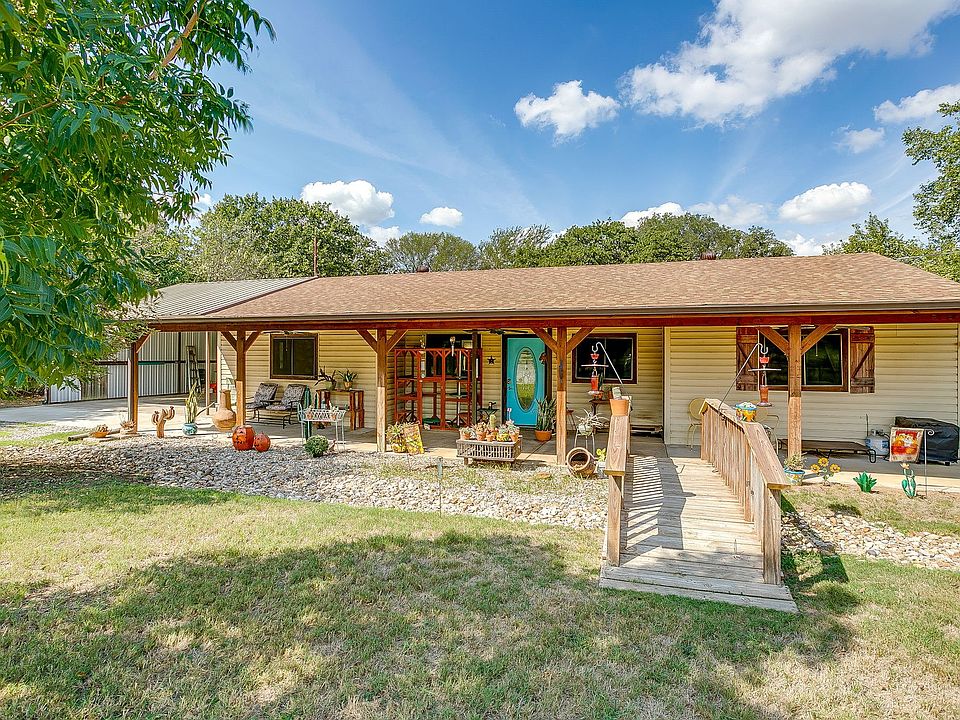Charming country home with huge covered front porch, and charming wood bridge. 6.49 acres with seasonal pond and creek. Private location outside the city limits allows you to have horses, cows, alpaca, or even miniature donkeys. Large barn with up to 4 stalls and corral. Fenced and cross fenced. Oversized tall carport for all your storage needs. Well house provides year round protection for your well and water softener system. Split bedroom arrangement with separate master suite. Stand up shower and walk in closet in master suite. Big hall bath with vessel sink has been updated. Wood look floors throughout this home. Kitchen and dining open space with breakfast bar in between. Plenty of cabinet and counter space plus built in dishwasher, garage disposal, and electric range. Separate microwave too. Dining space has plenty of room for a 6 or 8 person table and chairs. Bonus sunroom has windows all around. Located just minutes from Hwy. 114 for easy access to the DFW metroplex.