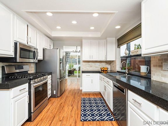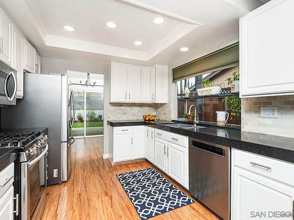 Relax & enjoy this family-friendly home with captivating mountain views. Updated single-story property in highly desirable neighborhood near the alluring Santee Lakes. When entering the home you will be wowed by the bright natural lighting, vaulted ceilings, & expansive wood laminate flooring. Kitchen boasts granite composite countertops, new stainless steel appliances, updated lighting, backsplash, and cabinetry. Entertain in your generously-sized living/dining area graced by a fireplace, huge windows...