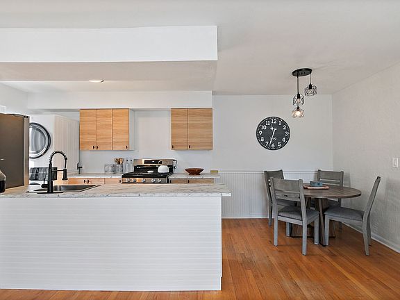 Nestled in a peaceful tree-lined community, this beautifully updated 2-bedroom, 1-bath home is a serene escape. An abundance of natural light streams in from the desirable east-facing exposure, creating a bright and airy atmosphere with fantastic breezes. The open floor plan showcases gleaming, hardwood flooring throughout. The fully remodeled kitchen shines with brand-new countertops, new modern cabinets, a new faucet, all new s/s appliances, plus a new stacked washer & dryer set. Additional upgrades include fresh paint in a clean, tastefully chosen neutral, new 6-panel doors, and new stylish light fixtures. The spacious primary bedroom features a huge walk-in closet with a custom shelving system, making storage both practical and stylish. This home also includes a one-car garage, an exterior space & visitor parking. The well-managed HOA takes care of all the details, including lawn care, snow removal, exterior maintenance, garbage service, and includes access to the outdoor pool! Enjoy move-in ready comfort in a peaceful setting for yourself or buy as an investment property to create residual income. Schedule your showing to see this gem today!