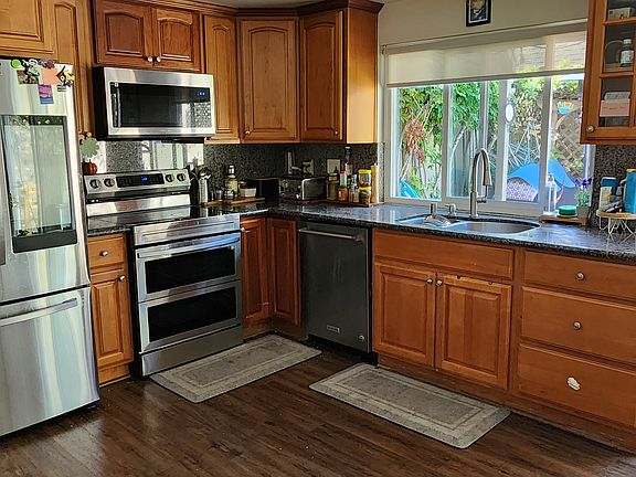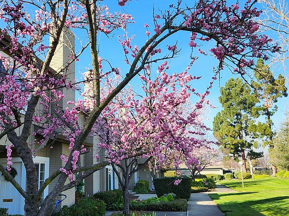 The kitchen is elegantly remodeled with granite counters and nice cabinets, plus distinctive new stainless appliances. Off the kitchen, the informal space can be used as a family room or for informal dining. Sliding doors lead into the superbly manicured backyard, offering a serene view and a relaxing spot to hang out. There is a convenient half bath for company downstairs. The Master suite has high ceilings and a terrific view into the large greenbelt. The home has double pane windows throughout to keep you warm and insulated. There is a capacious two-car detached garage with room for lots of storage, and shelves to help organize. This home is in the desirable Bay Vista complex, close to great restaurants and the bay levee walking trail.