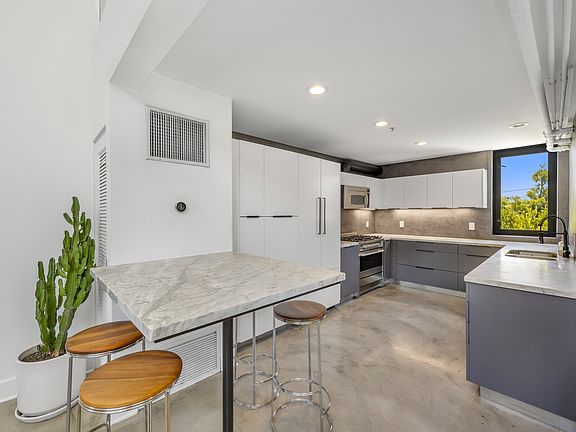 Nestled in the architecturally significant Lofts at Laurel Court awaits this one of a kind, newly rebuilt three story contemporary townhome with explosive views, custom finishes, and highly curated design. The Lofts at Laurel Court is a secure, extremely private community of twenty loft-style town homes situated in a tranquil tree-lined, open air courtyard setting right in the heart of West Hollywood. Upon entering unit 13, you are greeted by dramatic 2-story 17' high ceilings, massive picture windows, concrete floors, and a spacious living room bathed in natural light. The open concept designer done kitchen features Carrera marble countertops, custom cabinetry, and top of the line appliances including a JennAir built in fridge and Fisher & Paykel professional range. The lower level bedroom features an exposed beam ceiling, a large closet with washer/dryer, and double doors that open to a huge balcony with views of Century City and Hollywood hills. An ultra contemporary, custom-built wall of glass overlooking the living room borders the loft style master bedroom on the second level. The bathrooms feature custom built walnut vanities, top of the line designer fixtures, and Microcement imported from Spain. Unit 13's original 1220 square foot floor plan underwent a ~183 square feet expansion creating a bonus room on the second level, which is currently being used as a large closet/dressing room, and a huge den/media room on the third level with incredible views of Downtown to the east and Century City to the west. Enjoy breathtaking sunsets from the completely private 520+ square foot wrap-around rooftop patio, which is accessed from the third level and features explosive panoramic views from the Hollywood sign to Downtown to Century City to Hollywood hills and beyond. Additional features include European White Oak flooring, Teak decking, Lutron smart home lighting, Nest thermostat, LED lighting throughout, tankless water heater, and optional Hunter Douglas motorized shades. Control your lighting and temperature with Siri! This is a rare opportunity to lease a newly completed upper floor unit in one of the most sought after buildings in West Hollywood. No detail has been overlooked and no expense has been spared in this designer done loft.