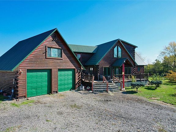 Stunning custom-built frame log home nestled on over twelve peaceful acres! With a perfect mix of rustic charm and modern amenities, this property offers two ponds, a 24x36 oversized attached two-car garage, and an additional 40x30 detached garage with a concrete floor. For even more storage or workspace, you'll find a 24x30 pole barn and a smokehouse on the property. Over nine acres are tillable, ideal for farming or outdoor activities. The spacious three-bedroom, three-and-a-half-bath home is designed for comfortable living and entertaining. Upon entering, you’ll be greeted by a large kitchen with plenty of counter space, an island, and a dining area perfect for family gatherings. The living room boasts a striking two-story fireplace, complete with a pellet stove to warm the entire home. Hardwood floors flow throughout both the main and second levels, enhancing the home’s natural warmth. The main bedroom is conveniently located on the first floor with an en suite bath. Upstairs, you'll find three additional bedrooms, including one above the garage with a full bath. This space served as the owners' retreat while the home was being designed and completed. A spacious loft area overlooks the living room and provides even more space for relaxation or play.