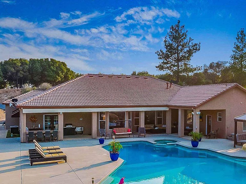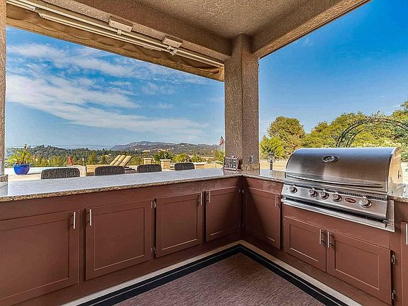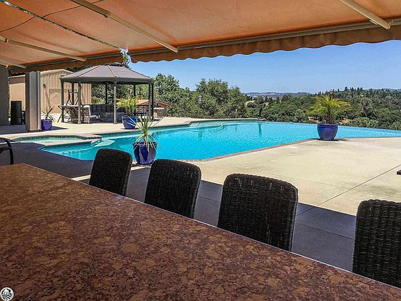 Are you looking for an Oasis? Look no further!!! This stunning single level home is tucked away on three impeccably manicured acres in the very desirable neighborhood of Springfield Estates. This pristine park like setting property is fully fenced and is accessed through a solar powered gate with an entertainers dream home sitting at the end of the circular driveway. This 3203 sq ft luxurious 3 bedroom, 3 bathroom home has been created for that indoor/outdoor Living experience. As you enter the home your eyes are instantly delighted by the large windows in the living room that overlooks the infinity edge pool and panoramic view. The living room is open to the Chef style kitchen with an abundance of storage, walk in pantry, stainless steel appliances, double oven, trash compactor, propane cooktop, and 2 inch thick chiseled edge granite countertops. The two island slabs of granite are one piece for that truly upscaled finished look. The Breakfast nook also has large windows that overlook the outside oasis with doors that exit from both sides and have phantom screens to allow the breeze to flow through the room. This home features a One-Of-a-Kind Stunning Bar "Where everybody knows your name." The bar granite is 3 inches thick with mirrored bar shelves, a mini fridge under the counter, and storage cabinets. The room itself lends to a place to spend some time, hang out, maybe play some games. The double doors open up to the outdoor kitchen and backyard paradise for that true indoor-outdoor feeling. The outdoor kitchen has granite countertops, Built in propane BBQ, power, and a sink with its own on demand hot-water. Sit back and relax with your favorite beverage on your chair, float in the huge edgeless infinity pool that looks as though it drops right into the trees or enjoy the jetted hot tub as you take in the beautiful view and peaceful feeling this property offers. You may even want to have some music playing. There are speakers wired throughout the home and out to the patio for your enjoyment, the covered outdoor living space is wired and mounted for a TV for further entertainment. Later in the day sit around the propane fire pit under the gazebo with family and friends roasting marshmallows or just sit quietly staring at the dancing flames as the wonderful memories of the day pass through your thoughts. The oversized gorgeous master suite has a propane stone tiled fireplace and double walk-in closets. From the luxurious marble tiled master bathroom you can enjoy the jetted jacuzzi tub and take in the beautiful view. Down the wide hallway you will find the cozy guest bedrooms, an oversized office with double doors to enter, and a full guest bathroom. As you enter the home there is a formal dining area that is currently used as a sitting room. If you are not one to have a formal table you can use your imagination here. It is a very versatile space. The Laundry room and a full bath are off the wide hall to the Bar and also access the oversized 4 car garage with storage cabinets that will stay with the property. The tankless water heater can also be found in the garage. The dual zoned heat and air system has a unit on both ends of the home and an 18x20 storage shed is out back on a concrete pad which could also be used as a small shop. It is equipped with electric, lights, and a fan that pulls the hot air out of the unit. The pool equipment is in its own house for protection against the weather. A generator switch is wired into the electric panel for those times of need. No expense was spared in creating this truly unique home. Located close to the Historical Columbia State Park where you can easily enjoy all of the local eateries and shopping. You will find Farmers Markets, Golfing, Hiking, Biking, Zip-Lining, Boating, Fishing, Swimming, Skiing, Trail Riding, Off Road Adventures, Historic State Parks, Yosemite and More are all close for your enjoyment. Make your appointment to see this home today.