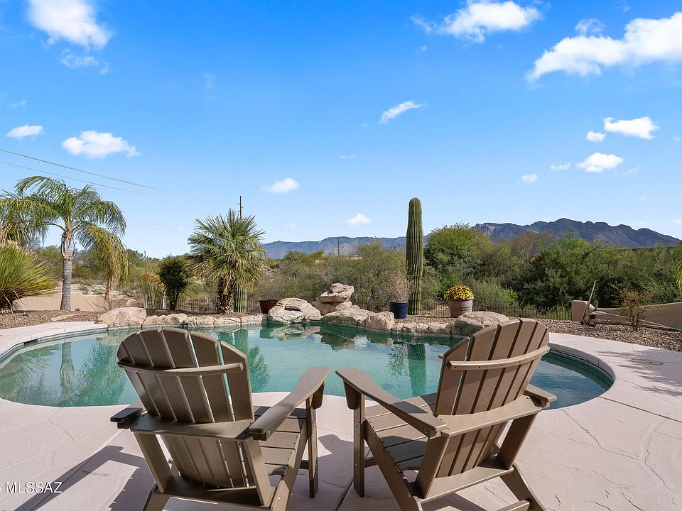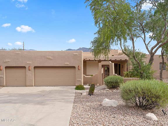 Former TJ Bednar model home showcasing timeless Southwestern design with stunning Catalina Mountain and city views. This beautifully crafted residence features viga-beamed ceilings, solid Alder wood doors, elegant lighted niches, and two inviting beehive fireplaces located in the Family Room and Living Room.The spacious kitchen offers an island with breakfast bar, double ovens, 42'' Alder cabinets, wine rack, desk area, and a bright nook.The east-facing backyard includes a solar-heated pool, spa, and water feature. Additional perks include an 11' garage ceiling, water softener loop, laundry room with cabinets, counter, sink, skylight, owned solar, and the rear lot for added privacy.