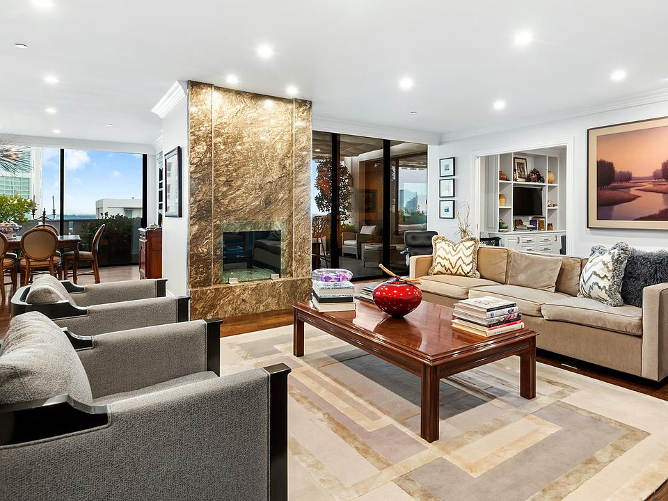 Beautifully designed 14th floor unit in the prestigious Wilshire Terrace. This bright, single level, 2,125 sqft home includes hardwood floors, high ceilings, recessed lighting, crown molding, and private terrace with expansive city views. The fully remodeled chef's kitchen is centered around the oversized marble island and is complete with custom cabinetry for ample storage and top of the line appliances which leads into the laundry area. The dining room boasts floor to ceiling windows and seamlessly flows into the formal living room and perfected with a stone fireplace. The den is easily made private with the ease of pocket doors allowing for a second bedroom or office. The primary suite is adorned with custom closets and spa like bathroom. This full Service Building offers valet parking, security, on site manager, pool, spa, gym, library, hair salon, rose garden, and dog park.