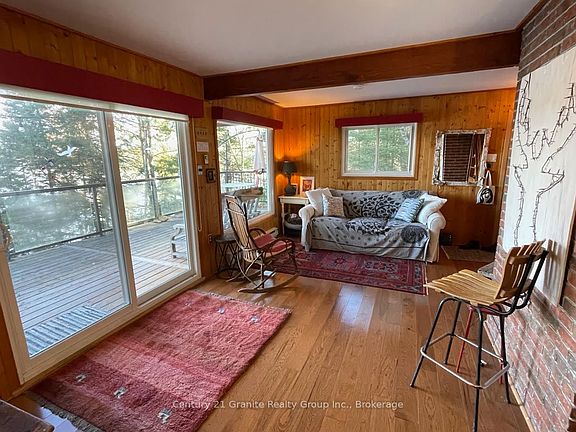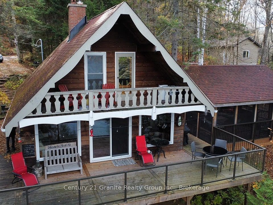 Welcome to this lovely 4-season chalet on spectacular Miskwabi Lake! Large lot with 190 feet of waterfront with clean rock and sand shoreline, and incredible big-lake view. Almost an acre of land, well-treed for great privacy. Nice level area at the waterfront and deep water off the dock - perfect for swimming and boating. Enjoy summer sunsets from the dock. Open-concept main floor features custom kitchen with granite countertops and island, and picture windows framing the awesome lake views. Walkout to large wraparound deck - and new 18' x 18' 3-season screened porch/sunroom with retractable window system - outdoor entertaining at its finest! Main floor has one bedroom and 4-piece bath. Upstairs there are two more bedrooms, including main bedroom facing the lake with its own private balcony. Downstairs there is a cozy rec room with walk out, wood stove, and lower floor laundry. Heated water line with UV system. Plus there's a newer 32' x 16' garage, with separate storage room - great for office space, games room or workshop. Easy access by year-round Municipal road - Broken Paddle is a quiet dead-end road with only 10 cottages. Just 20 minutes to Haliburton village for shopping and services. Miskwabi Lake is part of a 2-lake chain with Long Lake - located at the top of the watershed for exceptional water quality. Enjoy miles of boating, water sports and lake trout fishing on this desirable lake system.