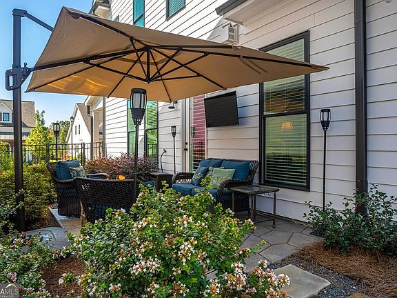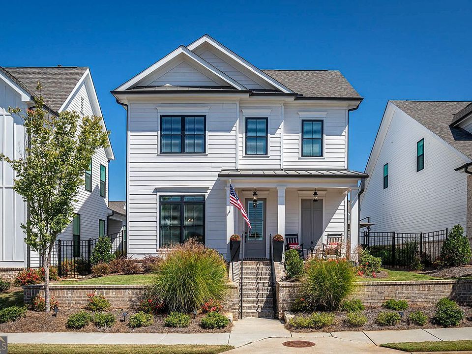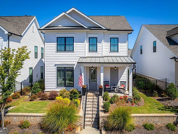 PRICE ADJUSTMENT! Step into luxury with this beautifully designed home featuring a spacious, open-concept floor plan and a thoughtful layout perfect for modern living. You'll honestly think you've stepped into a Model Home that's never been lived in. The owner's suite on the main level offers a true retreat with an oversized walk-in closet and a spa-inspired bath. The fully tiled mega shower with relaxing rainhead and beautiful fixtures creates a striking statement. The designer kitchen is equally impressive with quartz countertops, stacked white cabinetry extending to the ceiling, and a bold navy island with breakfast seating. An oversized pantry provides exceptional storage. The open flow connects seamlessly to the dining room, family room with painted brick fireplace, and out to the private stone patio-perfect for entertaining. Soaring 10-foot ceilings, 7-foot windows, and solid 8-foot doors on the main floor create an airy, grand atmosphere. Additional highlights include a large walk-in laundry room, convenient half bath, and premium finishes throughout. Upstairs, you'll find three spacious bedrooms and two full baths, plus ample attic storage. The rear-entry two-car garage offers extra hanging storage, private driveway parking. The back and side yard. provide a wrought-iron fenced-in area that is beautifully landscaped. Irrigation system keeps the lawn and shrubs green and healthy. Every detail has been thoughtfully upgraded in this premier home. Located in a gated, modern farmhouse-inspired community in Cherokee County, residents enjoy HOA-maintained homesites and resort-style amenities: a clubhouse, beautiful pool, pickleball courts, community garden, and walking trails. Yard maintenance is included in the HOA fees so plan on effortless weekends for rest or to enjoy your favorite activities. With shopping and top-rated schools just a mile away, this home offers both convenience and a retreat-like setting. Don't miss the opportunity to own this pristine home built by The Providence Group in a community that feels worlds away-yet close to everything you need.