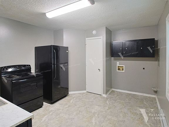Updated sinkCozy two-bedroomUpper cabinets for storageDual sinkBlack-painted cabinetsCeiling fanLaminate flooring