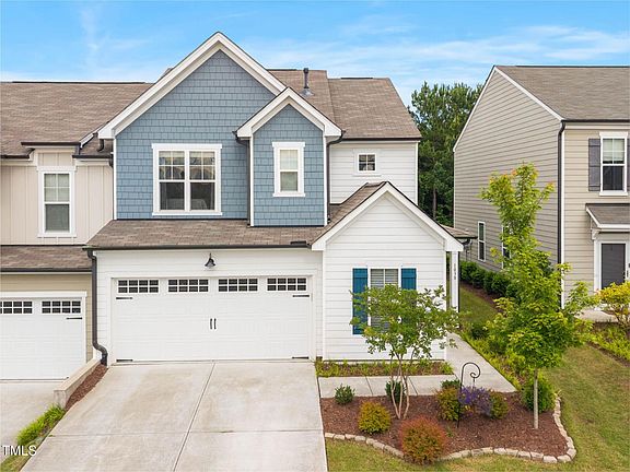Searching for a stunning, west-facing, recently built single-family home floor plan with modern upgrades and with the low-maintenance ease of a townhome, a fenced backyard with a patio, peaceful tree-lined views, added privacy, and your own private side entrance with a charming rocking chair porch? Your search has ended! Enter this spectacular end unit from your private porch and you'll be immediately impressed by well appointed touches like stylish wainscoting, oversized crown moldings and an elegant, half-turn staircase with with decorative metal balusters. To the left is your dedicated home office or mixed use room, away from the main living space for privacy. To the right you'll enter into the open, large and brightly lit family living area with windows abound. The nicely sized kitchen offers tons of storage with upgraded soft-close cabinets plus a pantry for more. Stainless steel appliances including a 5 burner gas cooktop, wide sink, granite counters and breakfast bar are great for everyday meals or lavish entertaining. A large, comfortable dining area and lovely sunroom complete the well appointed first floor. On the second floor of this magnificent two-story townhome you'll find your grand owner's suite with two walk-in closets, a splendid owner's bath with dual vanities, large walk-in shower plus linen storage. Two additional well-sized bedrooms with roomy closets, a full main bath with a tub and shower combo, additional linen storage, and a spacious laundry room is everything you need for easy, comfortable living in elevated style. Out back is a rare and welcome townhome feature: a large, private fenced back yard with custom patio pavers for grilling and chilling, all with an expansive view of manicured lawns and lush wooded backdrop. This wonderful community offers friendly and peaceful strolls on sidewalks and paths, a dog park and quiet, serene living with amazing views of dense and mature trees. Minutes to Brier Creek Country Club and Brier Creek Commons, RTP, RDU, Umstead Lake Park and major roadways, this Triangle location can't be beat for convenience and reputation. Balance of ten year structural warranty transfers to new owner.