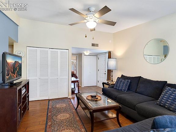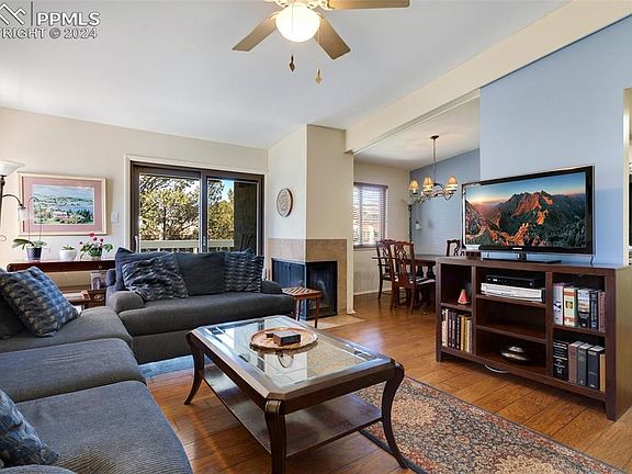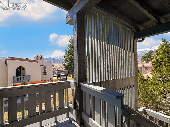 Nestled within the scenic Villa Sierra Complex, this delightful 2nd-floor end unit condo embodies the essence of the Colorado Springs lifestyle, offering captivating mountain views that never fail to enchant. Located in the sought-after west side of Colorado Springs, this residence boasts 2 bedrooms, 1 bath, and vaulted ceilings that enhance its spacious feel. Immerse yourself in the sweeping vistas of Pikes Peak from both the front and rear decks, while also enjoying breathtaking sights of the Garden of the Gods from this elevated community. Upon entering, you'll be greeted by modern upgrades, including hickory laminate flooring, solid surface countertops, and stainless steel appliances. A cozy gas fireplace sets the stage for cozy evenings, while the newly constructed rear deck invites you to savor peaceful mornings with a freshly brewed cup of coffee. Thoughtfully designed built-ins add both functionality and character to the living space, with custom dressers in the master bedroom and a versatile desk/cabinet ensemble in the second bedroom, perfect for creating a personalized home office. Other notable features include a dedicated dining room with a convenient small dish cabinet, a spacious storage room on the deck, and a generous covered carport with additional storage. Indulge in resort-style living with access to immaculately maintained grounds, boasting amenities such as a swimming pool, tennis courts, and clubhouse. Enhanced security measures, including a manned entrance and on-site 24/7 security, ensure peace of mind for residents of Villa Sierra. Additionally, the community offers a recycling program and ample guest parking. Conveniently located near shopping, dining, parks, trails, and entertainment, this community presents the epitome of Colorado Springs living.