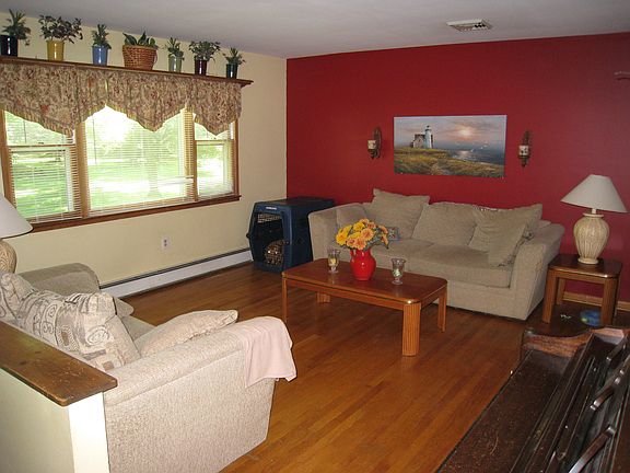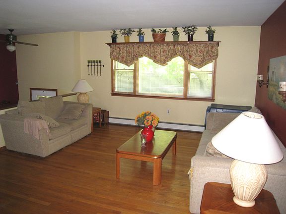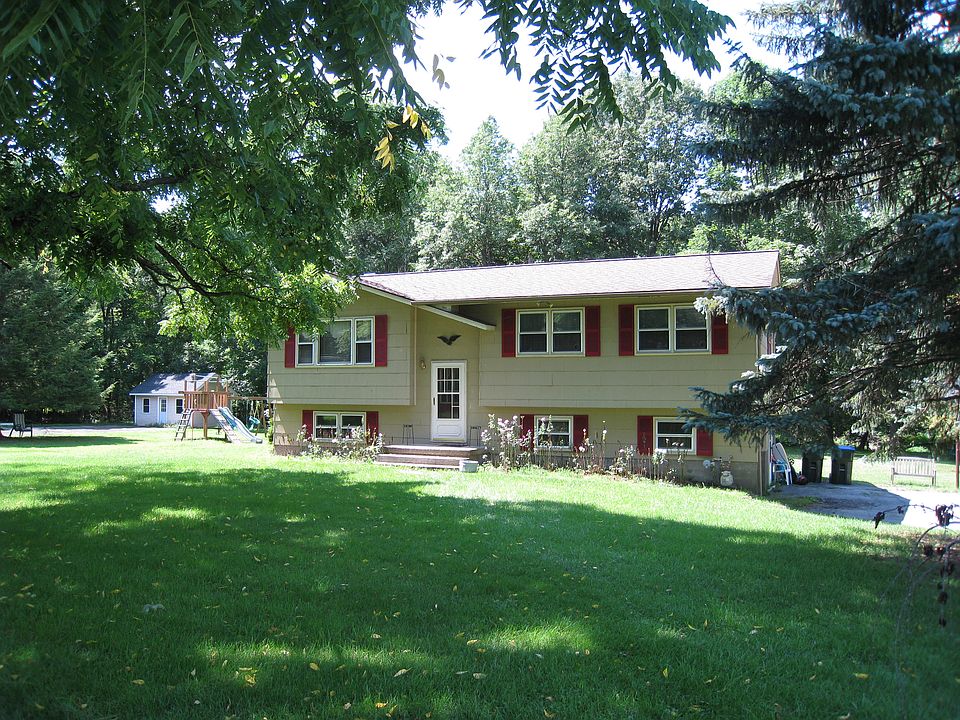Very private set off from the road on a flat lot of .6 acres. 3 bedrooms, Half baths with large family room with wood burning fireplace. Features include: central air conditioning, slider from kitchen to large deck, 1 car garage, shed and lots of storage space. Many updates such as: 7 yr old furnace, 6 yr old hot water heater, newer septic, 13 yr old roof and gutters and more. Great commuter location - close to 17a for bus to NYC. House has been updated with new windows , front and side Doors, storm doors and Patio slidding doors on the deck.