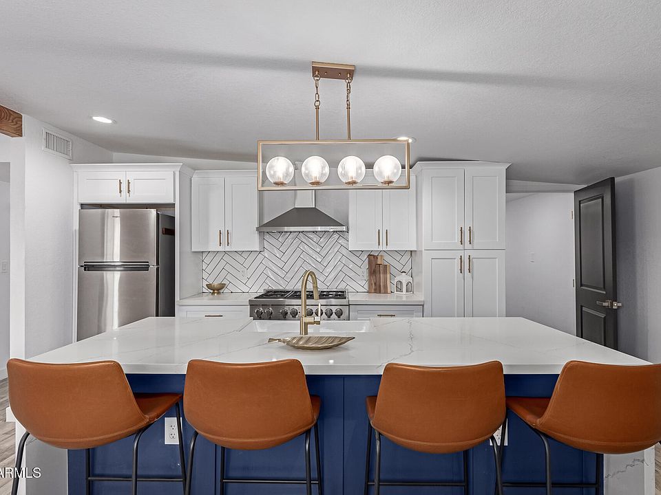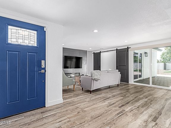 Close to everything Scottsdale has to offer, welcome HOME—where modern design meets everyday comfort! This light-filled, OPEN FLOOR PLAN features stylish fixtures, & a great room w/ fireplace feature wall that flows into the dining area complete w/sleek DRY BAR. The kitchen STUNS w/white Shaker cabinets, a bold island w/WATERFALL countertop, gold hardware, SS appliances including GAS RANGE, & herringbone tile backsplash. Primary suite offers TWO walk-in closets, modern accent wall, patio access, & a spa-like en-suite w/dual vanities & CUSTOM-tiled shower. Large secondary bedrooms & UPDATED bathroom add comfort & convenience. You'll also love the SPACIOUS laundry room w/sink—washer/dryer included! Enjoy a huge, backyard w/RV gate & paver patio-- perfect for entertaining or relaxing!
