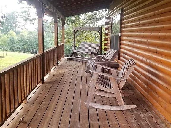 Rustic living at its best! Beautiful sunsets to be enjoyed from the front porch swing or rocking chair of your Satterwhite log home, overlooking rolling pasture land. It is cross fenced and ready for your livestock on the 8 plus acres, with a spring fed pond. The inside boast an oversized stone fireplace with open floor plan of living room, kitchen and dining room under the cathedral ceiling. It has Spruce logs through out and both front and back porches extend the full length of the house.