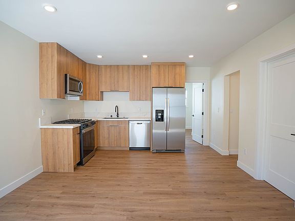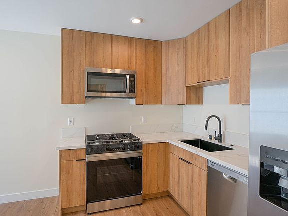 From the moment you step inside, you'll notice the bright and open layout with large windows that fill the space with natural light. The interiors feature Mid-Century inspired finishes with warm, wide plank floors that create a welcoming and modern feel. The kitchen stands out with brand new stainless steel appliances including a gas stove, refrigerator, dishwasher, and microwave, paired with sleek quartz countertops and European style cabinetry with timeless black finishes. Whether you love cooking at home or simply want a modern space that feels stylish and easy to enjoy, this kitchen delivers. The living area flows seamlessly, perfect for relaxing or entertaining, with new finishes throughout that make the home feel warm and inviting. And because everything in the unit is brand new, from the appliances to the AC, plumbing, electrical, windows, and finishes, you'll be the very first to experience it all.