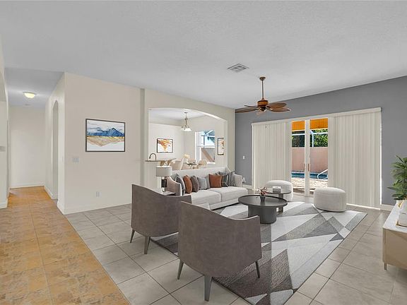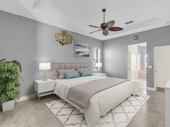 Experience relaxed Florida living in this 4bed, 3bath, 2,300 sq ft home in Port St. Lucie. The open layout features volume ceilings, tile floors, and split-bedroom design. The eat-in kitchen boasts 42-inch cabinets, granite countertops and Samsung stainless steel appliances. Primary suite includes two walk-in closets, dual vanity sinks, tub and walk-in shower. A versatile cabana suite offers a 36-jet walk-in tub, ideal for guests or caregiver space. Step outside to your private south-facing retreat, perfectly positioned for all-day sun, with a screened pool, heated spa with waterfall, natural stone pavers, a 6-ft concrete privacy wall, and a covered patio ideal for entertaining. Located near Whispering Pines Community Park with tennis, pickleball, trails, playgrounds, and open green space.